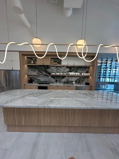 Achieving this level of perfection came with challenges — curved porcelain walls requiring flawless veining, new tooling for custom edge profiles, seamless integrated sinks, and layered fluting executed with zero margin for error. Every element demanded collaboration, creativity, and true technical mastery. The CR Design Center at Westside stands as a living portfolio of what’s possible when design, fabrication, and innovation meet.